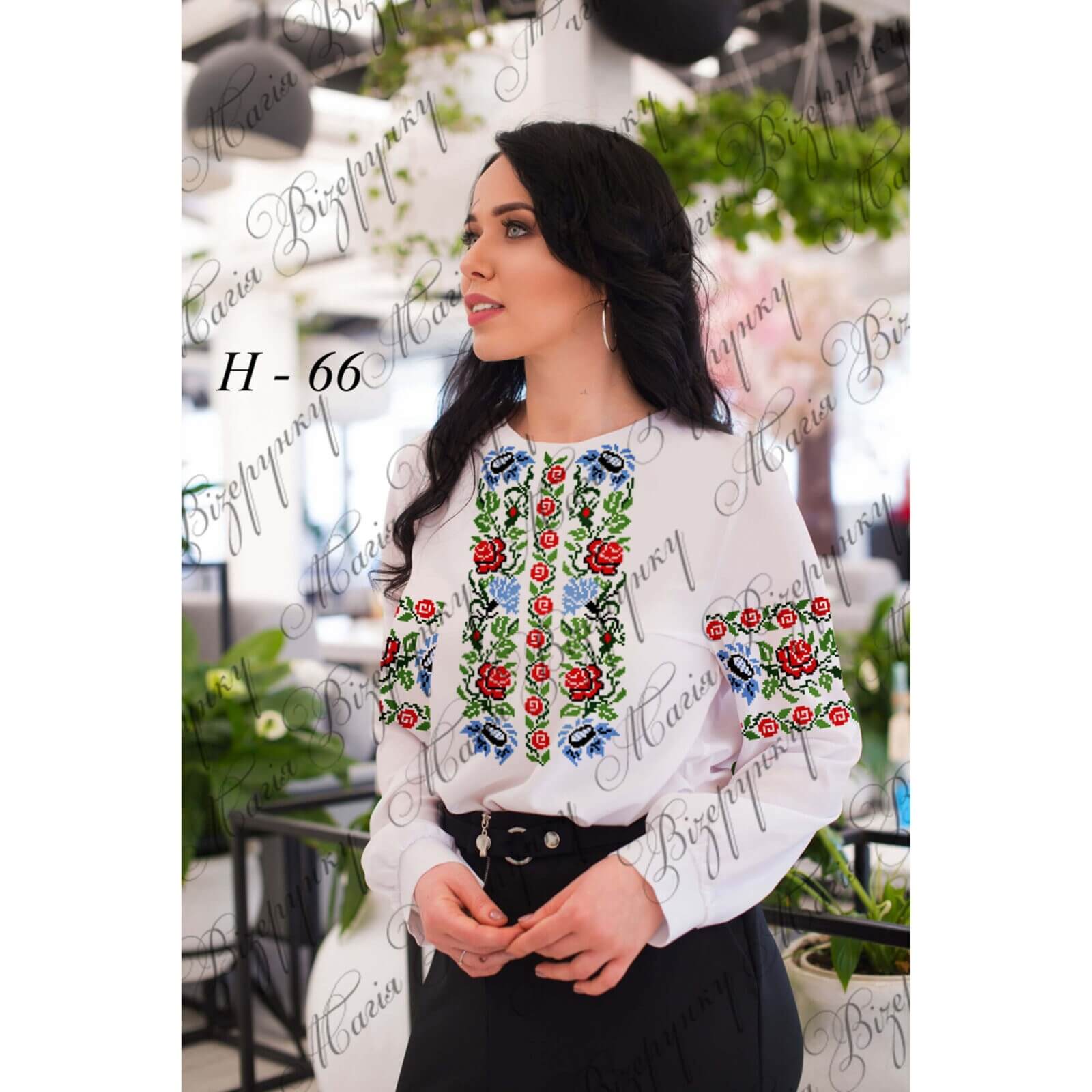 Заготовка складається з двох полотен 75*75 см на передню частину і на спинку (без вишивки) та двох полотен 75*65 см на рукави. В комплект входить інструкція в якій вказано кольори бісеру і його кількість, рекомендовані номери ниток DMC. Дану заготовку ви можете скроїти за своїми розмірами та фасоном.
