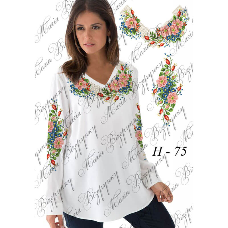 Заготовка складається з двох полотен 75*75 см на передню частину і на спинку (без вишивки) та двох полотен 75*65 см на рукави. В комплект входить інструкція в якій вказано кольори бісеру і його кількість, рекомендовані номери ниток DMC. Дану заготовку ви можете скроїти за своїми розмірами та фасоном.