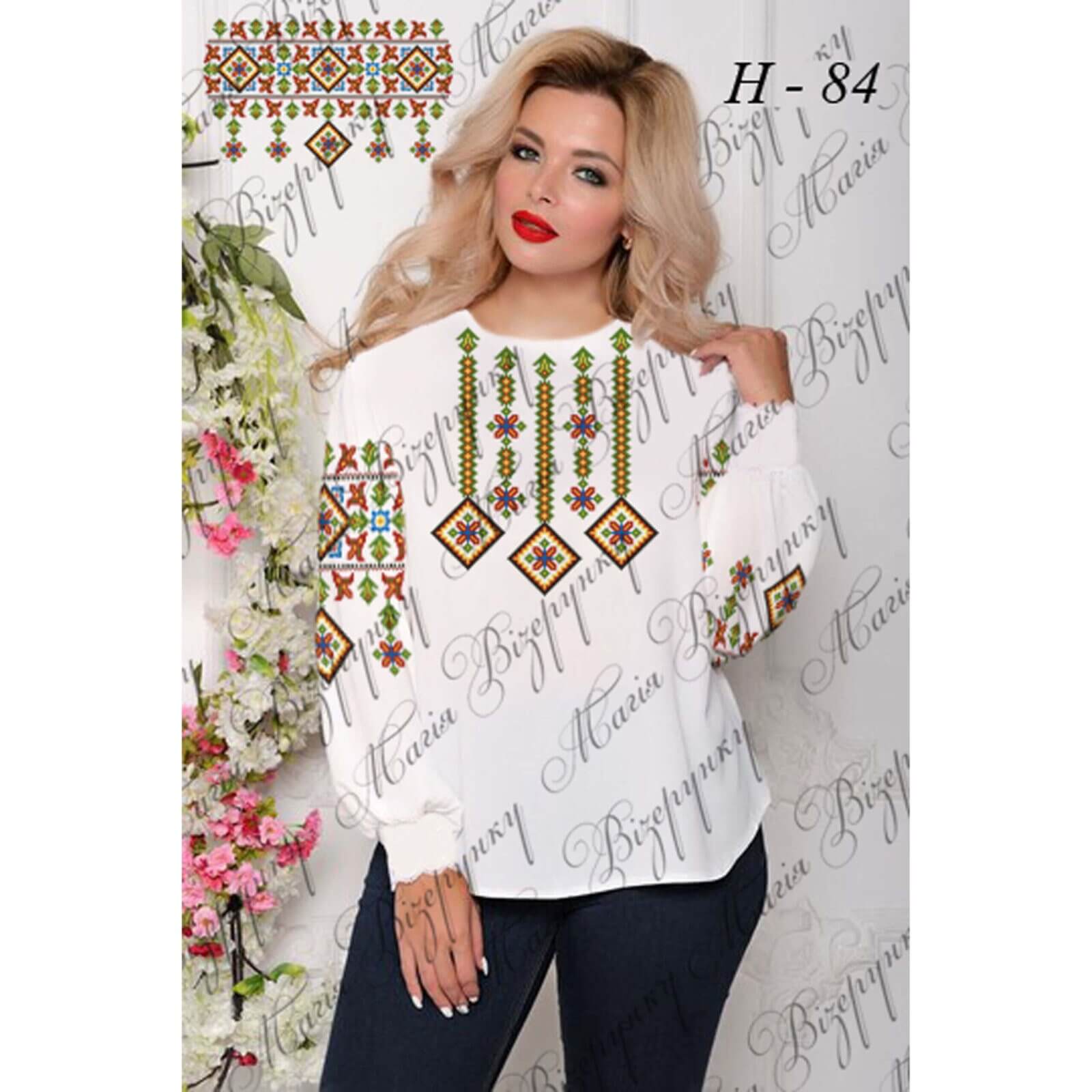 Заготовка складається з двох полотен 75*75 см на передню частину і на спинку (без вишивки) та двох полотен 75*65 см на рукави. В комплект входить інструкція в якій вказано кольори бісеру і його кількість, рекомендовані номери ниток DMC. Дану заготовку ви можете скроїти за своїми розмірами та фасоном.