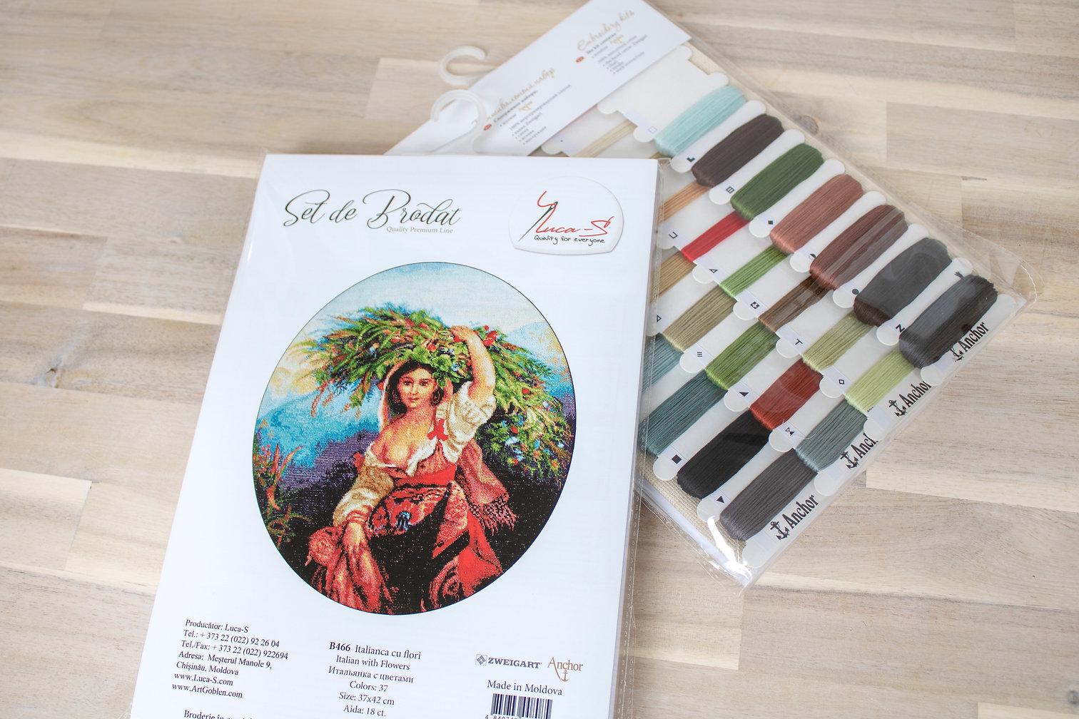 У набір входить: інструкція, кольорова символьна схема, тканина для вишивання, голка