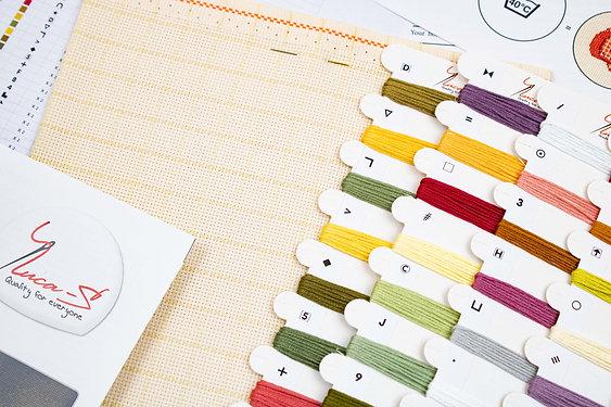У набір входить: інструкція, кольорова символьна схема, тканина для вишивання, голка
