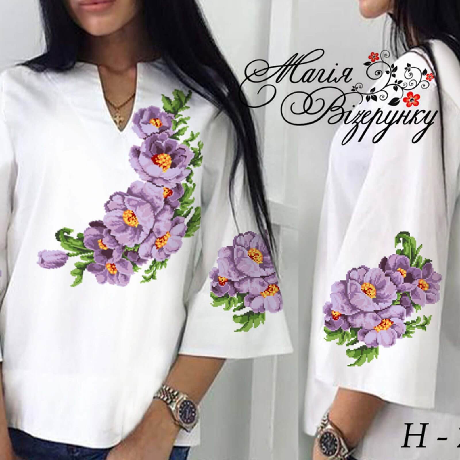 Жіноча сорочка для вишивки бісером, нитками або в змішаній техніці з нанесеною повноколірною схемою на тканині. Заготовка складається з двох полотен 75*75 см на передню частину і на спинку (без вишивки) та двох полотен 75*65 см на рукави. В комплект входить інструкція в якій вказано кольори бісеру і його кількість, рекомендовані номери ниток DMC. Дану заготовку ви можете скроїти за своїми розмірами та фасоном.