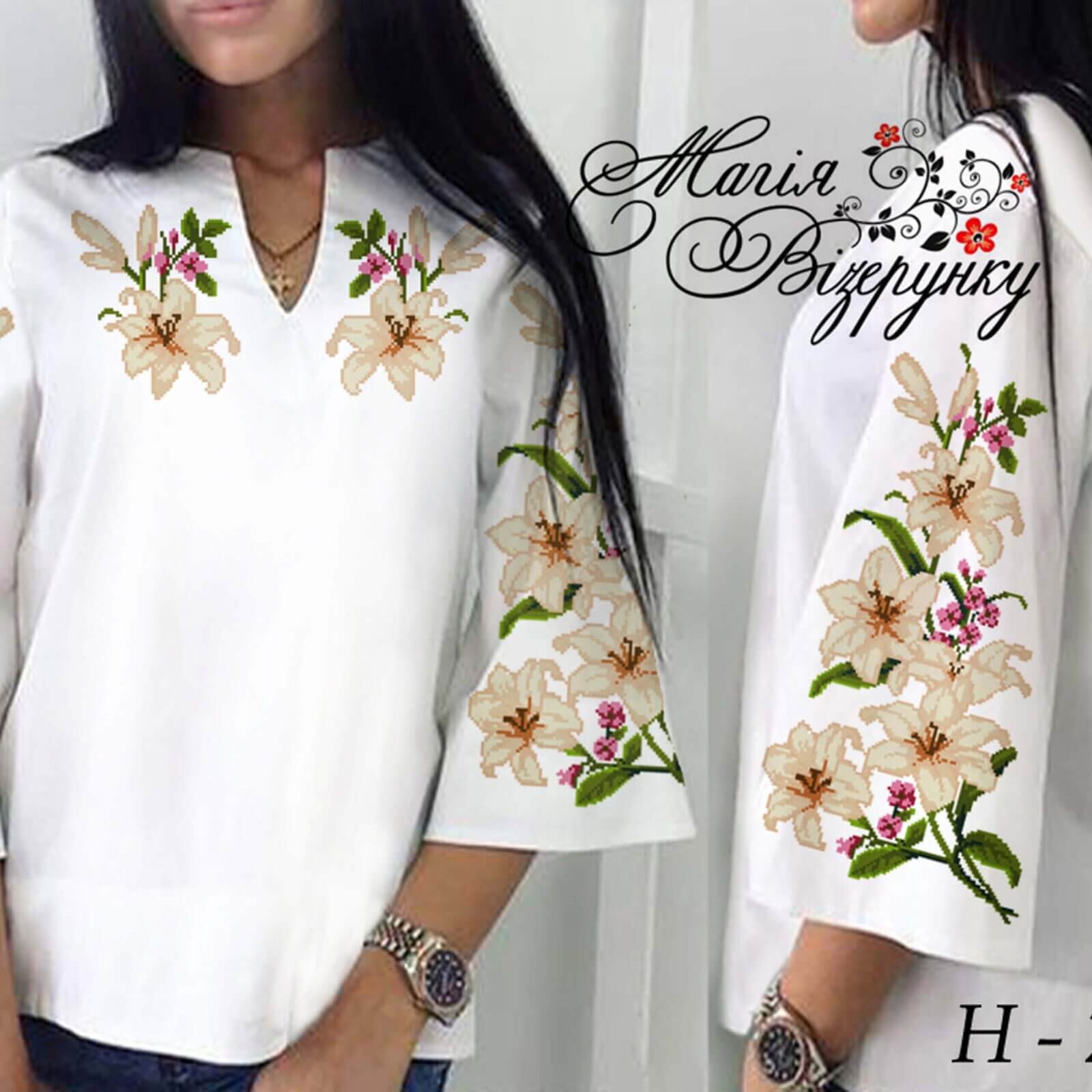 Жіноча сорочка для вишивки бісером, нитками або в змішаній техніці з нанесеною повноколірною схемою на тканині. Заготовка складається з двох полотен 75*75 см на передню частину і на спинку (без вишивки) та двох полотен 75*65 см на рукави. В комплект входить інструкція в якій вказано кольори бісеру і його кількість, рекомендовані номери ниток DMC. Дану заготовку ви можете скроїти за своїми розмірами та фасоном.
