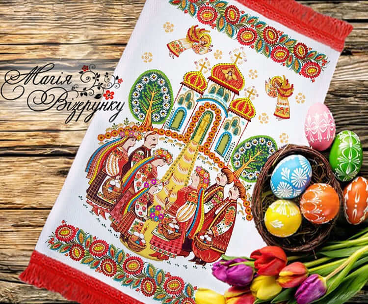 Набір містить заготовку на пасхальний рушник РП-31 для вишивки бісером або нитками з нанесеним малюнком-схемою та інструкцію до вишивання від виробника “Магія Візерунку”. В інструкції до вишивання вказані кольори та кількість бісеру фірми Preciosa.