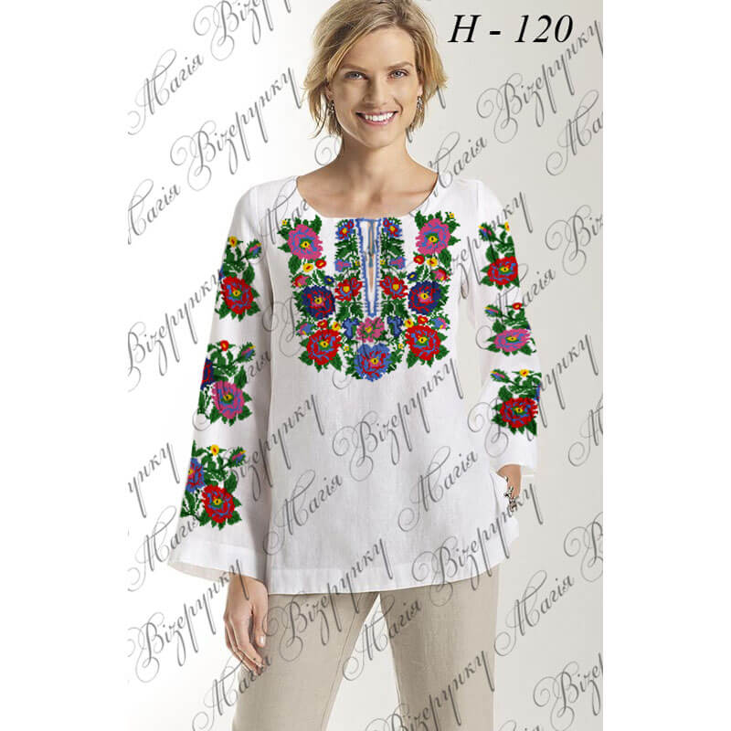 Заготовка складається з двох полотен 75*75 см на передню частину і на спинку (без вишивки) та двох полотен 75*65 см на рукави. В комплект входить інструкція в якій вказано кольори бісеру і його кількість, рекомендовані номери ниток DMC. Дану заготовку ви можете скроїти за своїми розмірами та фасоном.