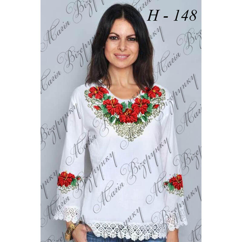 Заготовка складається з двох полотен 75*75 см на передню частину і на спинку (без вишивки) та двох полотен 75*65 см на рукави. В комплект входить інструкція в якій вказано кольори бісеру і його кількість, рекомендовані номери ниток DMC. Дану заготовку ви можете скроїти за своїми розмірами та фасоном.