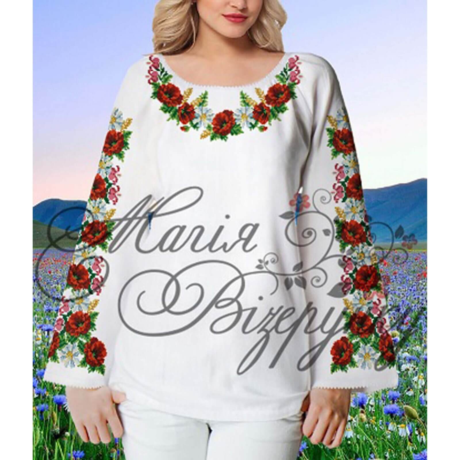 Заготовка складається з двох полотен 75*75 см на передню частину і на спинку (без вишивки) та двох полотен 75*65 см на рукави. В комплект входить інструкція в якій вказано кольори бісеру і його кількість, рекомендовані номери ниток DMC. Дану заготовку ви можете скроїти за своїми розмірами та фасоном.