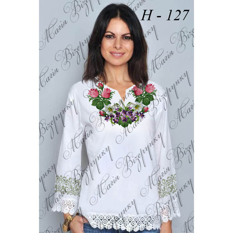 Заготовка складається з двох полотен 75*75см на передню частину і на спинку (без вишивки) та двох полотен 75*65 см на рукави. В комплект входить інструкція в якій вказано кольори бісеру і його кількість, рекомендовані номери ниток DMC. Дану заготовку ви можете скроїти за своїми розмірами та фасоном.