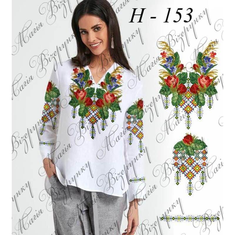 Заготовка складається з двох полотен 75*75 см на передню частину і на спинку (без вишивки) та двох полотен 75*65 см на рукави. В комплект входить інструкція в якій вказано кольори бісеру і його кількість, рекомендовані номери ниток DMC. Дану заготовку ви можете скроїти за своїми розмірами та фасоном.