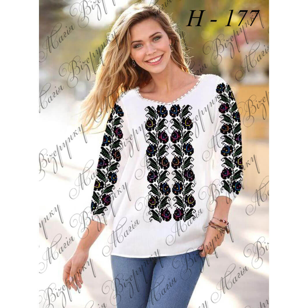 Заготовка складається з двох полотен 75*75 см на передню частину і на спинку (без вишивки) та двох полотен 75*65 см на рукави. В комплект входить інструкція в якій вказано кольори бісеру і його кількість, рекомендовані номери ниток DMC. Дану заготовку ви можете скроїти за своїми розмірами та фасоном.
