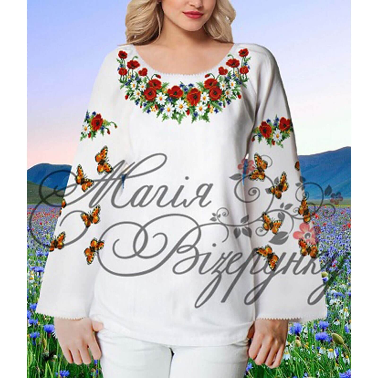 Заготовка складається з двох полотен 75*75 см на передню частину і на спинку (без вишивки) та двох полотен 75*65 см на рукави. В комплект входить інструкція в якій вказано кольори бісеру і його кількість, рекомендовані номери ниток DMC. Дану заготовку ви можете скроїти за своїми розмірами та фасоном.