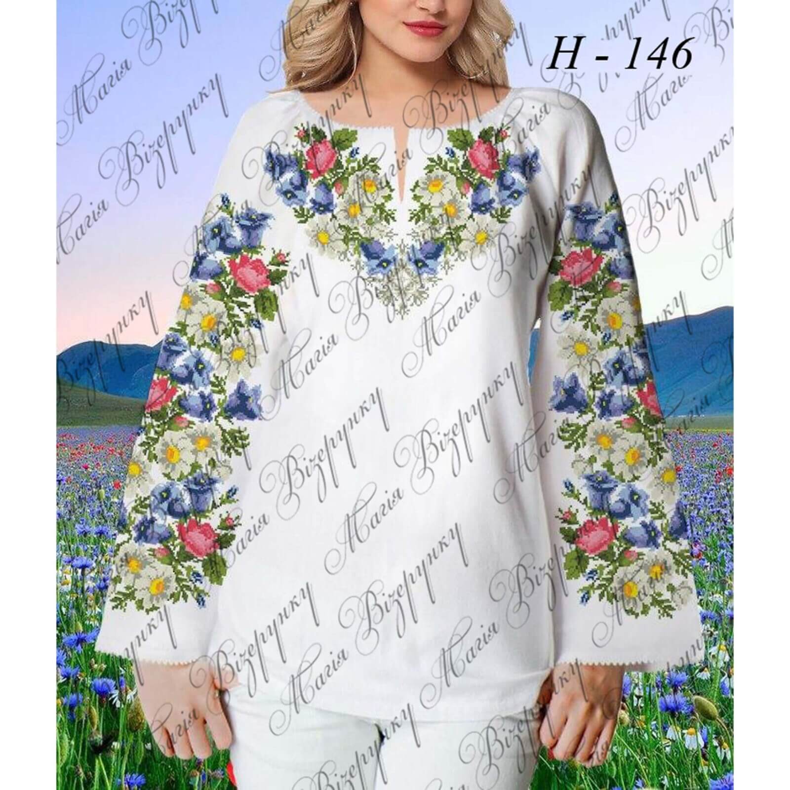 Заготовка складається з двох полотен 75*75 см на передню частину і на спинку (без вишивки) та двох полотен 75*65 см на рукави. В комплект входить інструкція в якій вказано кольори бісеру і його кількість, рекомендовані номери ниток DMC. Дану заготовку ви можете скроїти за своїми розмірами та фасоном.