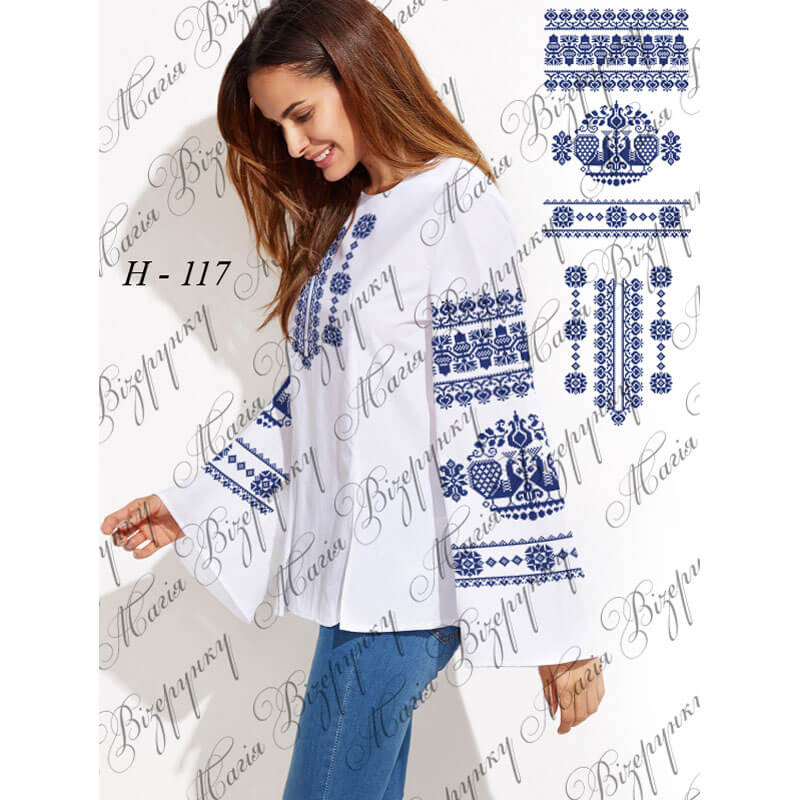 Заготовка складається з двох полотен 75*75см на передню частину і на спинку (без вишивки) та двох полотен 75*65 см на рукави. В комплект входить інструкція в якій вказано кольори бісеру і його кількість, рекомендовані номери ниток DMC. Дану заготовку ви можете скроїти за своїми розмірами та фасоном.