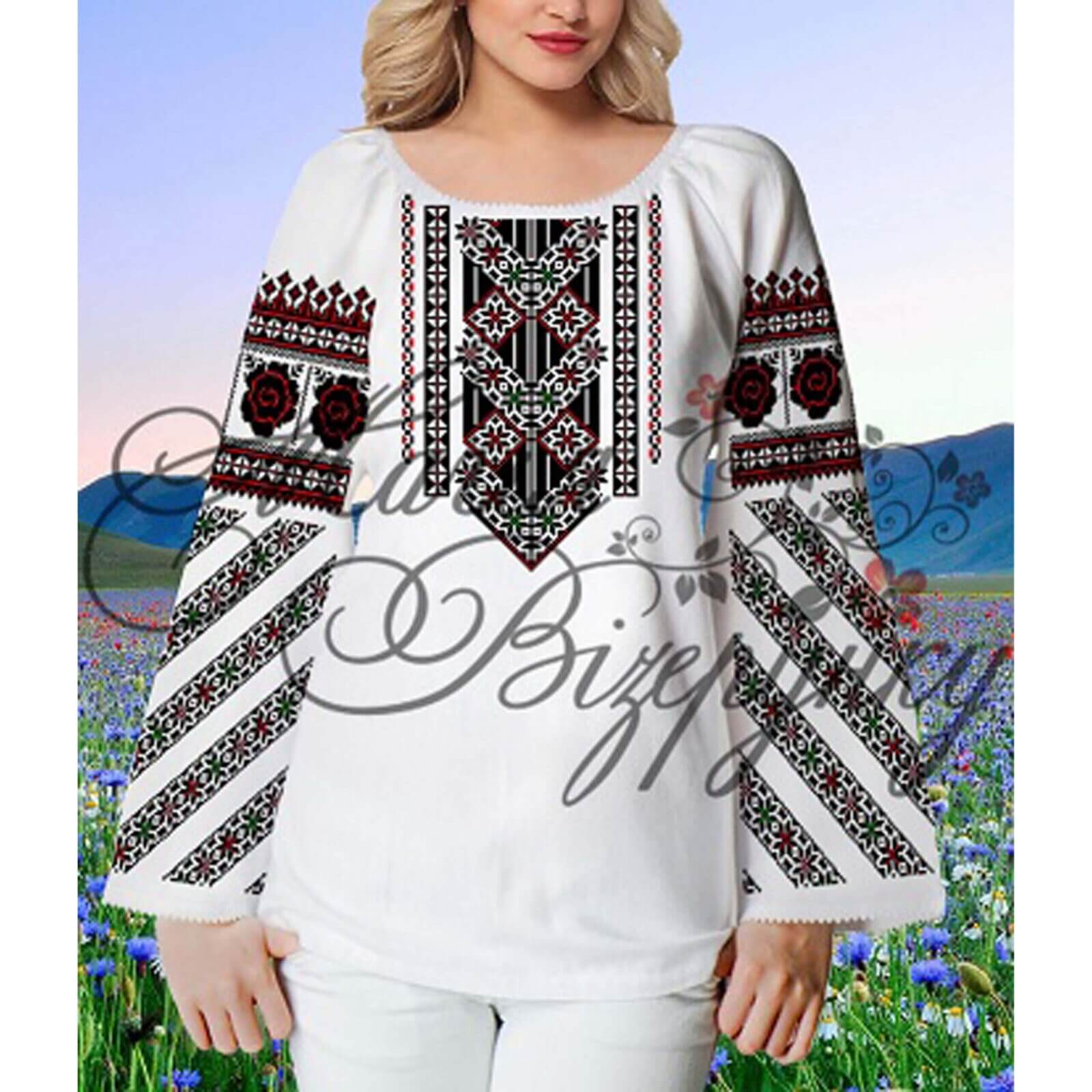 Заготовка складається з двох полотен 75*75 см на передню частину і на спинку (без вишивки) та двох полотен 75*65 см на рукави. В комплект входить інструкція в якій вказано кольори бісеру і його кількість, рекомендовані номери ниток DMC. Дану заготовку ви можете скроїти за своїми розмірами та фасоном.