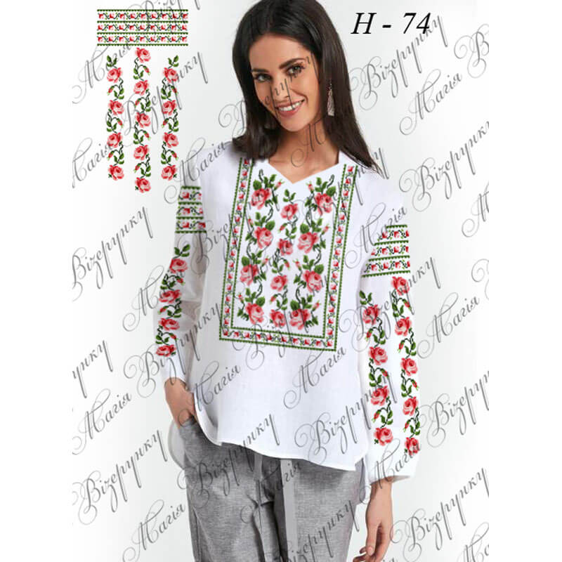 Заготовка складається з двох полотен 75*75 см на передню частину і на спинку (без вишивки) та двох полотен 75*65 см на рукави. В комплект входить інструкція в якій вказано кольори бісеру і його кількість, рекомендовані номери ниток DMC. Дану заготовку ви можете скроїти за своїми розмірами та фасоном.