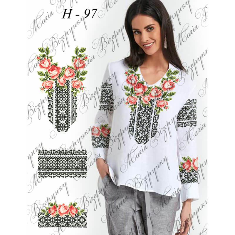 Заготовка складається з двох полотен 75*75см на передню частину і на спинку (без вишивки) та двох полотен 75*65 см на рукави. В комплект входить інструкція в якій вказано кольори бісеру і його кількість, рекомендовані номери ниток DMC. Дану заготовку ви можете скроїти за своїми розмірами та фасоном.