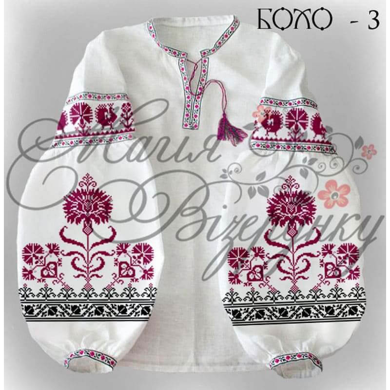 Жіноча сорочка Бохо-3 для вишивки бісером, нитками або в змішаній техніці з нанесеною повноколірною схемою на тканині. Заготовка складається з двох полотен 75*75 см на передню частину і на спинку (без вишивки) та двох полотен 75*75 см на рукави. В комплект входить інструкція в якій вказано кольори бісеру і його кількість, рекомендовані номери ниток DMC. Дану заготовку ви можете скроїти за своїми розмірами та фасоном. Можливі тканини: • домоткана біла (40% бавовна 60% поліестер) • габардин білий (100% поліестер, не мнеться, добре носитися, добре пропускає повітря, гірше пропускає вологу) При бажанні комплектуємо чеським бісером з 15% запасом, а також ниткою для бісеру та голкою