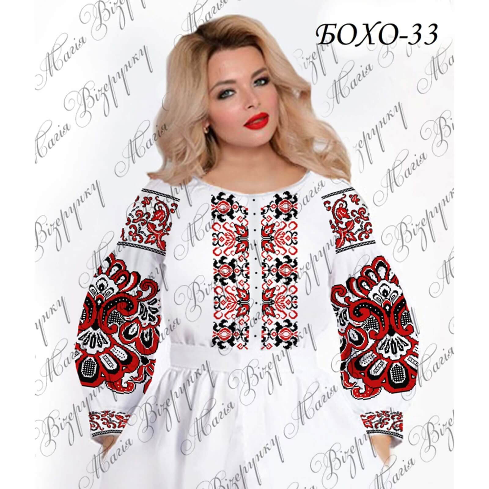 Жіноча сорочка Бохо-33 для вишивки бісером, нитками або в змішаній техніці з нанесеною повноколірною схемою на тканині. Заготовка складається з двох полотен 75*75 см на передню частину і на спинку (без вишивки) та двох полотен 75*75 см на рукави. В комплект входить інструкція в якій вказано кольори бісеру і його кількість, рекомендовані номери ниток DMC. Дану заготовку ви можете скроїти за своїми розмірами та фасоном. Можливі тканини: • домоткана біла (40% бавовна 60% поліестер) • габардин білий (100% поліестер, не мнеться, добре носитися, добре пропускає повітря, гірше пропускає вологу) При бажанні комплектуємо чеським бісером з 15% запасом, а також ниткою для бісеру та голкою