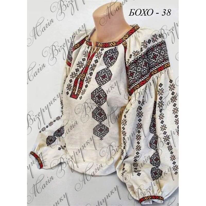 Жіноча сорочка Бохо-38 для вишивки бісером, нитками або в змішаній техніці з нанесеною повноколірною схемою на тканині. Заготовка складається з двох полотен 75*75 см на передню частину і на спинку (без вишивки) та двох полотен 75*75 см на рукави. В комплект входить інструкція в якій вказано кольори бісеру і його кількість, рекомендовані номери ниток DMC. Дану заготовку ви можете скроїти за своїми розмірами та фасоном. Можливі тканини: • домоткана біла (40% бавовна 60% поліестер) • габардин білий (100% поліестер, не мнеться, добре носитися, добре пропускає повітря, гірше пропускає вологу) При бажанні комплектуємо чеським бісером з 15% запасом, а також ниткою для бісеру та голкою