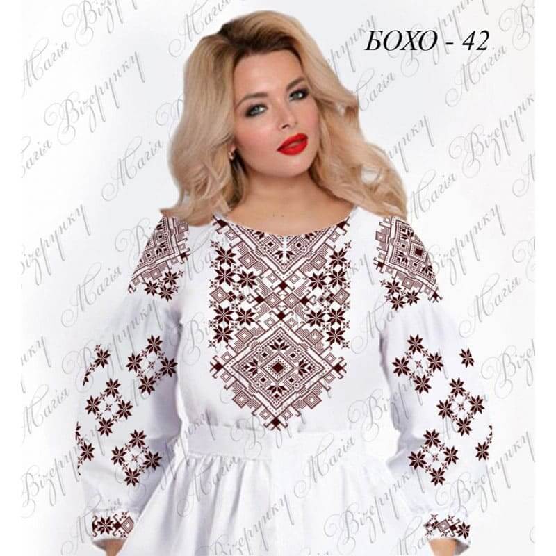 Жіноча сорочка Бохо-42 для вишивки бісером, нитками або в змішаній техніці з нанесеною повноколірною схемою на тканині. Заготовка складається з двох полотен 75*75 см на передню частину і на спинку (без вишивки) та двох полотен 75*75 см на рукави. В комплект входить інструкція в якій вказано кольори бісеру і його кількість, рекомендовані номери ниток DMC. Дану заготовку ви можете скроїти за своїми розмірами та фасоном. Можливі тканини: • домоткана біла (40% бавовна 60% поліестер) • габардин білий (100% поліестер, не мнеться, добре носитися, добре пропускає повітря, гірше пропускає вологу) При бажанні комплектуємо чеським бісером з 15% запасом, а також ниткою для бісеру та голкою