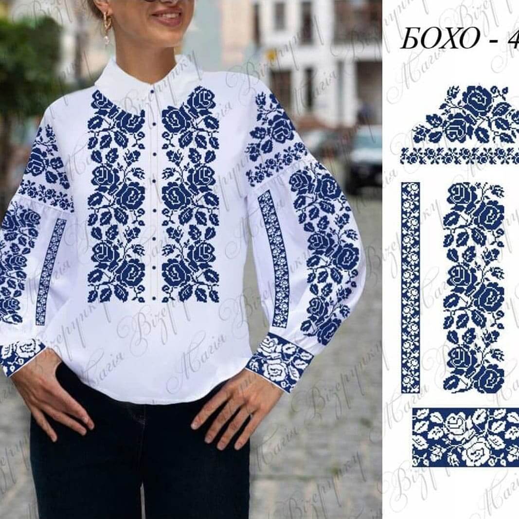 Жіноча сорочка Бохо-45 для вишивки бісером, нитками або в змішаній техніці з нанесеною повноколірною схемою на тканині. Заготовка складається з двох полотен 75*75 см на передню частину і на спинку (без вишивки) та двох полотен 75*75 см на рукави. В комплект входить інструкція в якій вказано кольори бісеру і його кількість, рекомендовані номери ниток DMC. Дану заготовку ви можете скроїти за своїми розмірами та фасоном. Можливі тканини: • домоткана біла (40% бавовна 60% поліестер) • габардин білий (100% поліестер, не мнеться, добре носитися, добре пропускає повітря, гірше пропускає вологу) При бажанні комплектуємо чеським бісером з 15% запасом, а також ниткою для бісеру та голкою