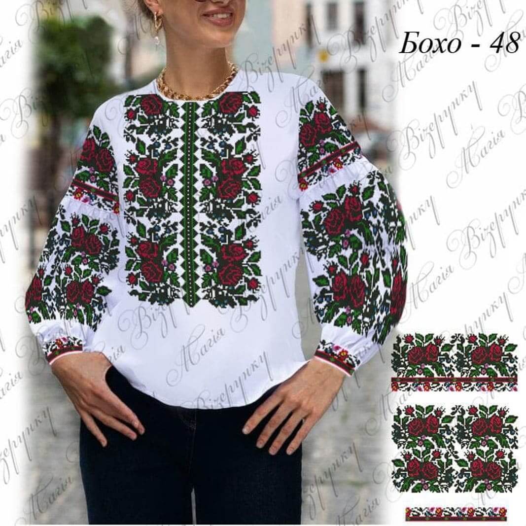 Жіноча сорочка Бохо-48 для вишивки бісером, нитками або в змішаній техніці з нанесеною повноколірною схемою на тканині. Заготовка складається з двох полотен 75*75 см на передню частину і на спинку (без вишивки) та двох полотен 75*75 см на рукави. В комплект входить інструкція в якій вказано кольори бісеру і його кількість, рекомендовані номери ниток DMC. Дану заготовку ви можете скроїти за своїми розмірами та фасоном. Можливі тканини: • домоткана біла (40% бавовна 60% поліестер) • габардин білий (100% поліестер, не мнеться, добре носитися, добре пропускає повітря, гірше пропускає вологу) При бажанні комплектуємо чеським бісером з 15% запасом, а також ниткою для бісеру та голкою