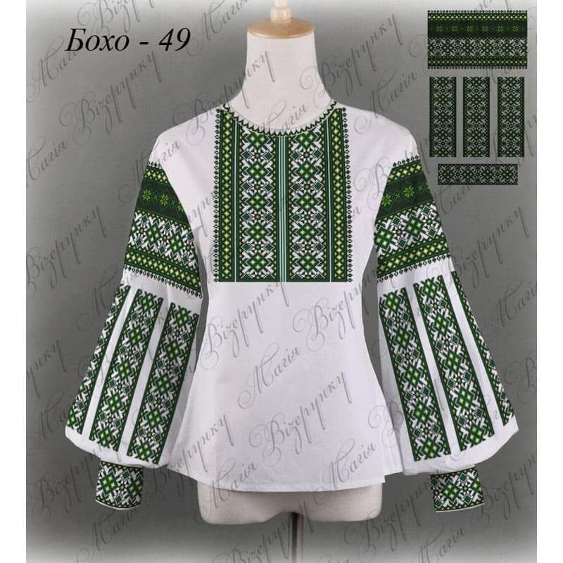 Жіноча сорочка Бохо-49 для вишивки бісером, нитками або в змішаній техніці з нанесеною повноколірною схемою на тканині. Заготовка складається з двох полотен 75*75 см на передню частину і на спинку (без вишивки) та двох полотен 75*75 см на рукави. В комплект входить інструкція в якій вказано кольори бісеру і його кількість, рекомендовані номери ниток DMC. Дану заготовку ви можете скроїти за своїми розмірами та фасоном. Можливі тканини: • домоткана біла (40% бавовна 60% поліестер) • габардин білий (100% поліестер, не мнеться, добре носитися, добре пропускає повітря, гірше пропускає вологу) При бажанні комплектуємо чеським бісером з 15% запасом, а також ниткою для бісеру та голкою